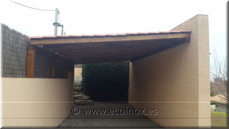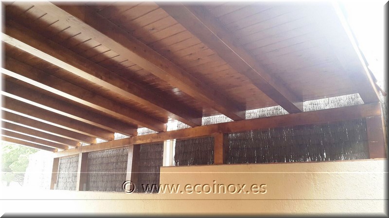 Es tracta d'una pèrgola de mides 4x6 m2, feta amb fusta d'avet laminat amb bigues quadrades de 120x120 mm.