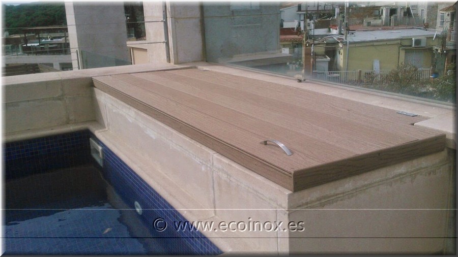 Recentment, ECOINOX ha instal·lat una nova TAPA DE MOTOR de piscina. Aquest innovador model de tapa està format per llistons de tarima de fusta composta, dos braços hidràulics i una maneta inoxidable.